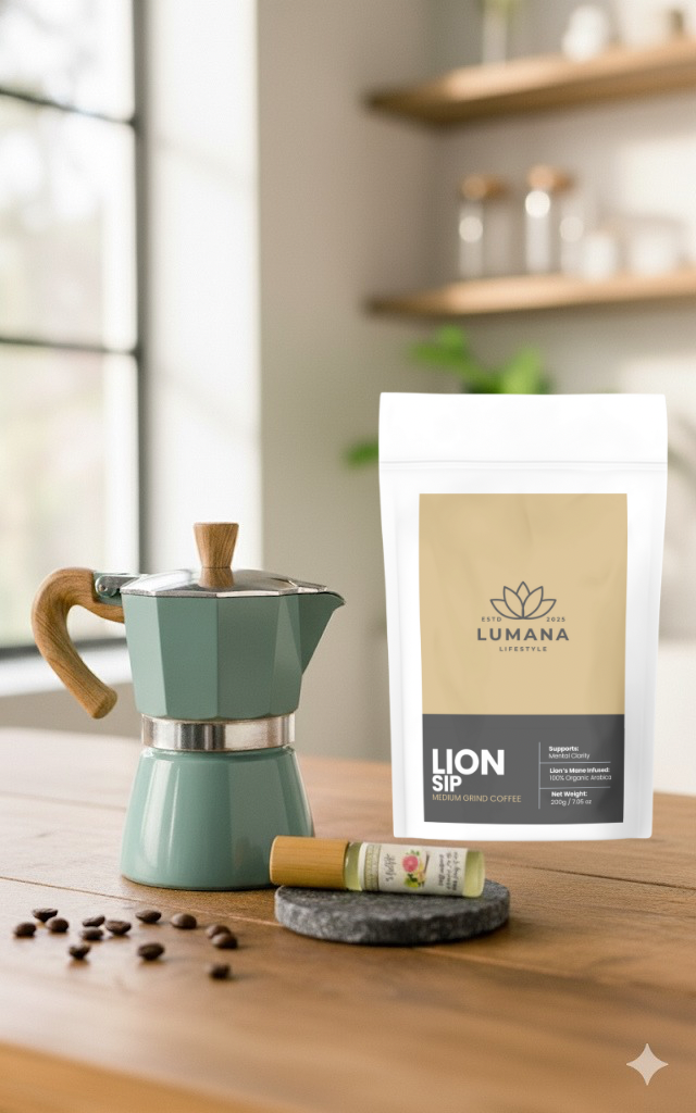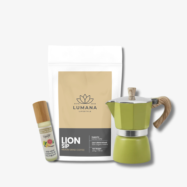 This is not just a cup of coffee; it's a mindful practice for clarity. We’ve paired our signature Lion's Mane coffee with a classic Italian Moka Pot for a rich, aromatic brew. To complete the ritual, we’ve included an NZ-made aromatherapy roll-on, your pocket-sized tool to maintain energy and focus throughout the day.