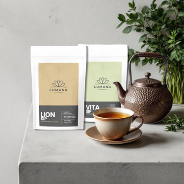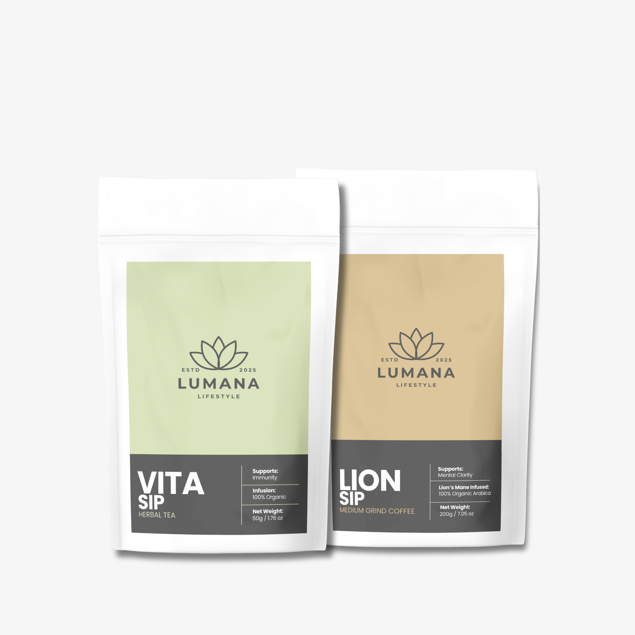 What’s Inside Lion Sip – Awakened Coffee (150g / 5.29oz) – A premium instant coffee blend infused with potent Lion’s Mane extract for focus and clarity. Vita Sip – Herbal Tea (50g / 1.76oz) – A 100% organic, loose-leaf blend thoughtfully formulated to support immune health and daily resilience.