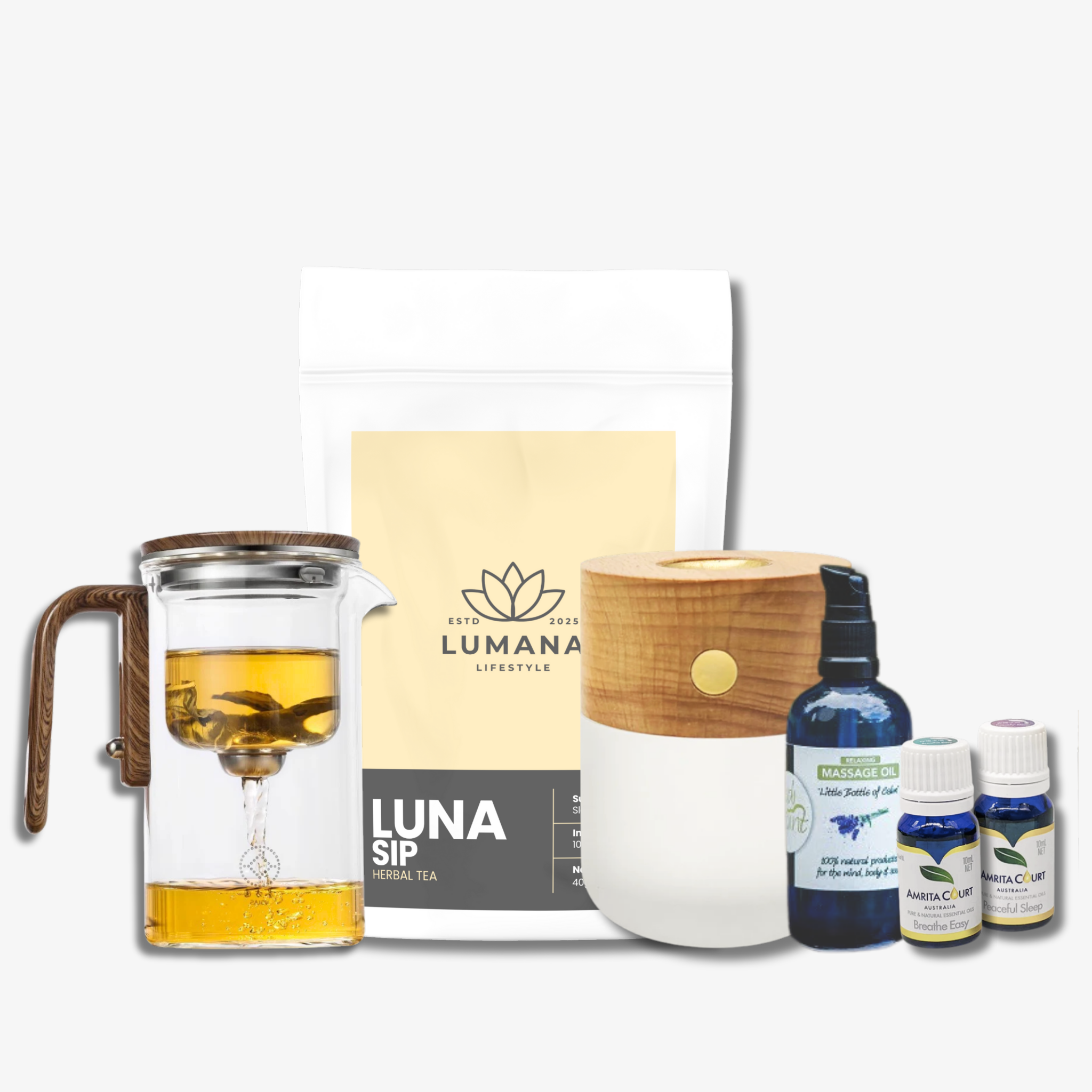Transform your evenings into a peaceful self-care ritual with the Lumana Daily Rest Ritual Collection — a curated set designed to calm your mind, nourish your body, and support deep, restorative sleep.
